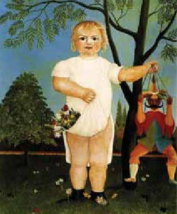 Henri Rousseau era um pintor amador que só entrou no mundo da arte aos 41 anos. Na "anarquia" do pós-impressionismo, os duelos com Georges Seurat foram evidentes: Seurat era o intelectual, o líder do movimento e inventor do pontilhismo; Rousseau era "o ignorante", "e os seus quadros tinham o sucesso de uma farsa", escreve Cornelia Stabenow, autora de "Rousseau", o livro de amanhã da Colecção Privada. Mas Picasso disse: "Rousseau não é um caso. Representa de maneira perfeita, uma ordem muito precisa e estabelecida de pensar." O que é que isto quer dizer? O que resta de fascinante em Rousseau é a forma como consegue chegar a "soluções artísticas intuitivas, que correspondem sempre à sua natureza ingénua", escreve Stabenow. Ou seja, "move-se entre os extremos, a impressão óptica e o resultado visionário, o que explica por que é que os tradicionalistas e os vanguardistas desde muito cedo concordam em rotulá-lo de 'naïf'". Rousseau é, assim, um "artista de um contra-mundo intransponível e repleto de magia". E é porque pinta o que vê e como o vê, "sem ser incomodado por dúvidas e objectivos intelectuais", que este quadro é exemplar na sua obra. A vida de Rousseau foi trágica: após a morte da primeira mulher (cujo luto exibiu sempre como um "herói"), também os seus quatro filhos morreram cedo, de tuberculose. Foi em 1903, que pintou o quadro "A Criança e a Marioneta". Por que razão esta é uma obra-chave? "O mito da criança como inocência e originalidade torna-se dominante. Todos os que se vêem como seguidores de Rousseau, seguindo o lema 'voltar à Natureza', exigem também o retorno à infância. A visão racional do mundo deverá ser superada, o início e a integridade retomados", explica a autora. São principalmente poetas, artistas e teóricos de arte, como Alfred Jarry, Guillaume Apollinaire, Odilon Redon, Robert Delaunay ou Kandinsky que, "fartos da tradição institucionalizada", contribuem para a fama de Rousseau. Porque ele é "o velho infantil da arte, o grande ingénuo, que longe da reflexão e do requinte negativos, sabe criar, em sincera harmonia consigo e com os seus dons". Este quadro parece ser a definição do pintor: há uma harmonia com a natureza e uma sensação de protecção, aconchego. "A marioneta, símbolo do mecânico e da alienação, ainda não aparece como dominador neste mundo paradisíaco", diz a autora. Esse boneco é quase um "auto-retrato" do pintor, com o seu enorme bigode. Aqui, a criança, de formas exageradamente redondas, como em Botero,