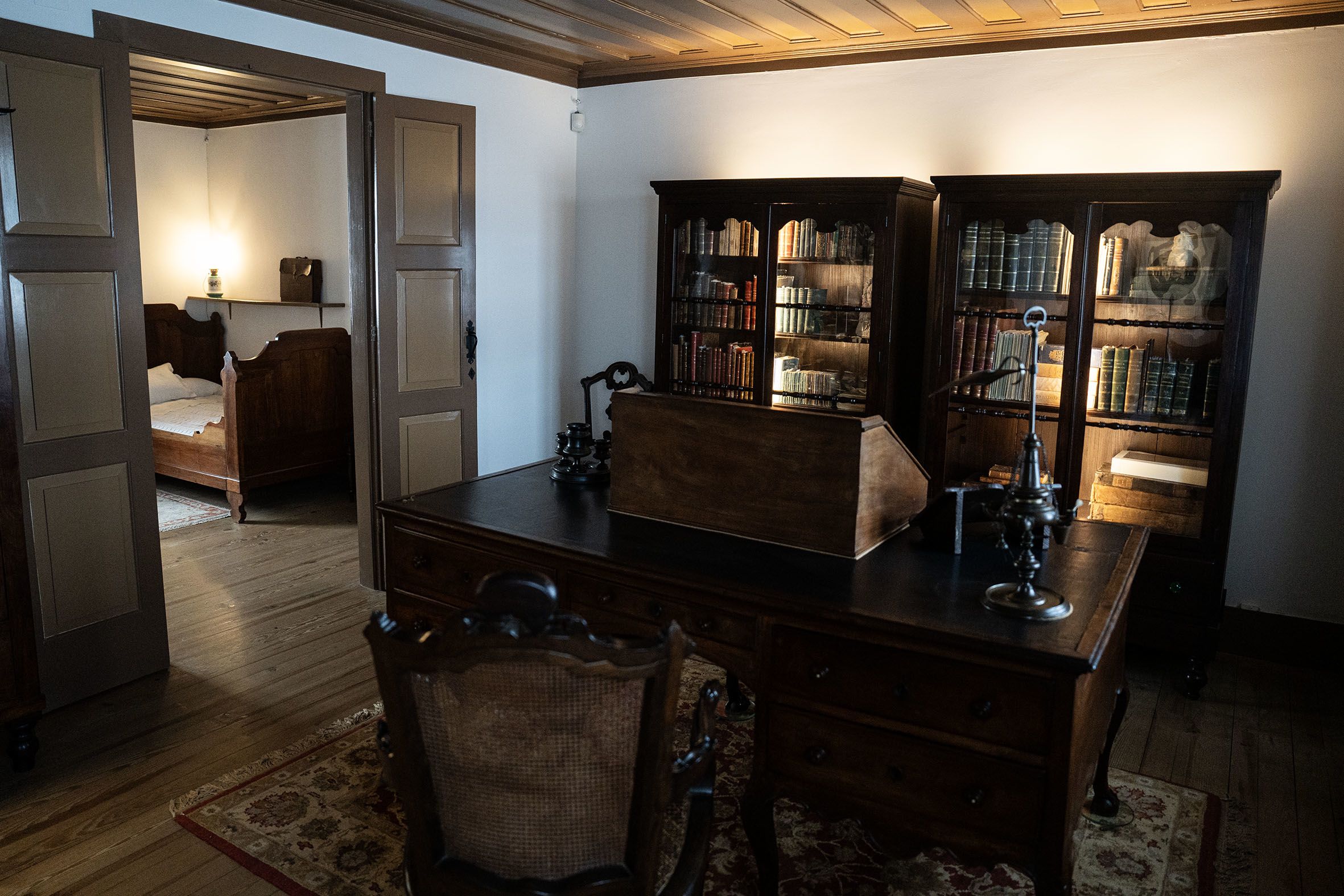 “É o grande altar da literatura portuguesa!”, exclama o guia, mostrando o móvel de duas faces que permitia a Camilo e Ana Plácido trabalharem em simultâneo, sempre que necessário. “Esta secretária foi o suporte material da sua escrita, seguramente a forja de muitas das suas melhores obras, muitas vezes à luz da vela”, reafirma. Um espaço “observado” por retratos de Alexandre Herculano, Balzac e Victor Hugo, figuras da cabeceira de Camilo. Ao lado da secretária, um armário-biblioteca guarda os perto de 800 volumes que sobraram dos cinco mil que Camilo levou a leilão em Lisboa, em 1883.